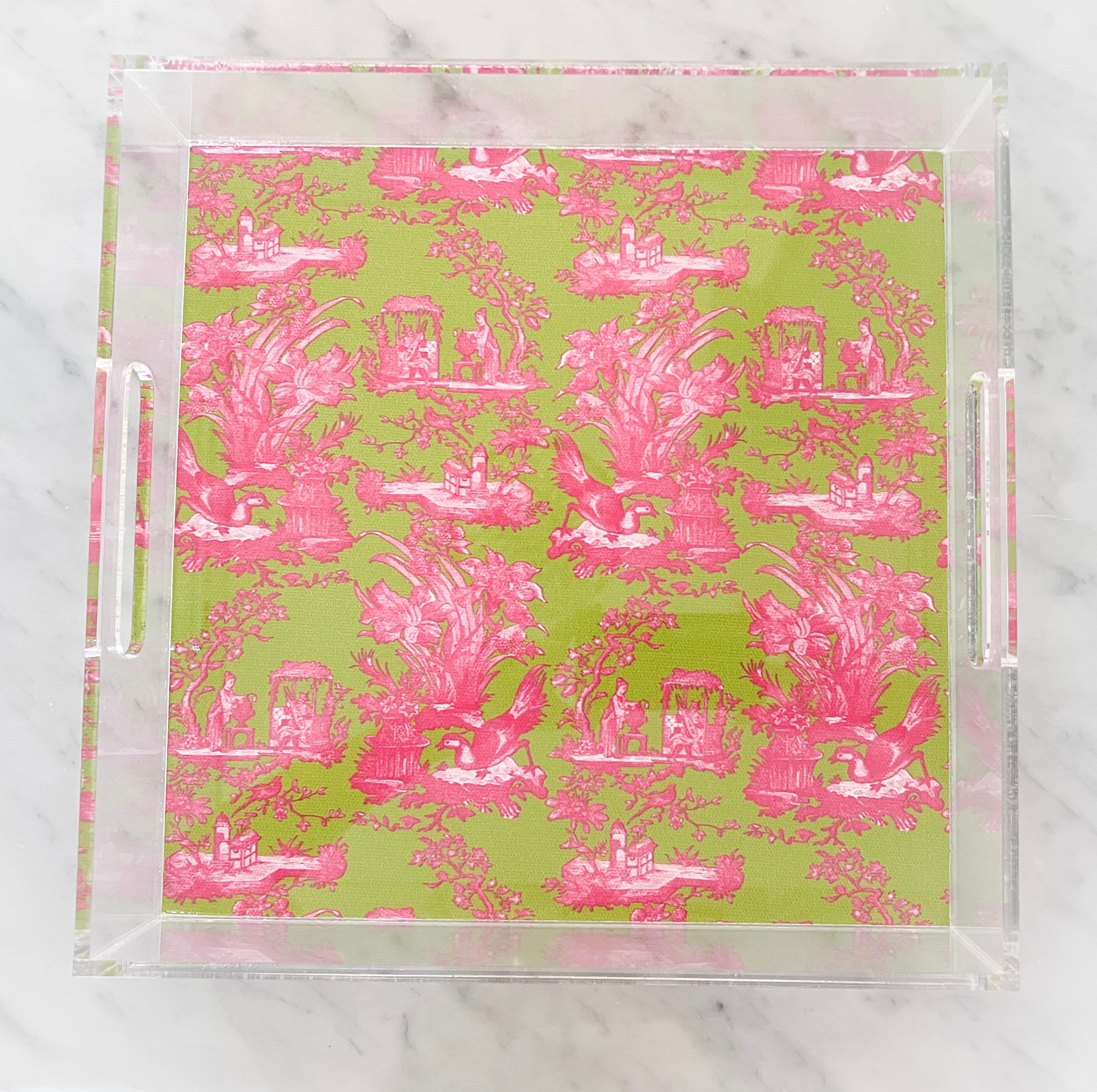 The Chinoiserie Acrylic Tray is a classic and timeless piece that will add color and personality to your space. It is a beautiful piece that can be used in your living space, for entertaining or decor on a bookshelf. Because of its roots in European design, chinoiserie lends itself beautifully to traditional and modern interiors. The tray displays the conventional Asian scenes of pagodas, birds, and nature.