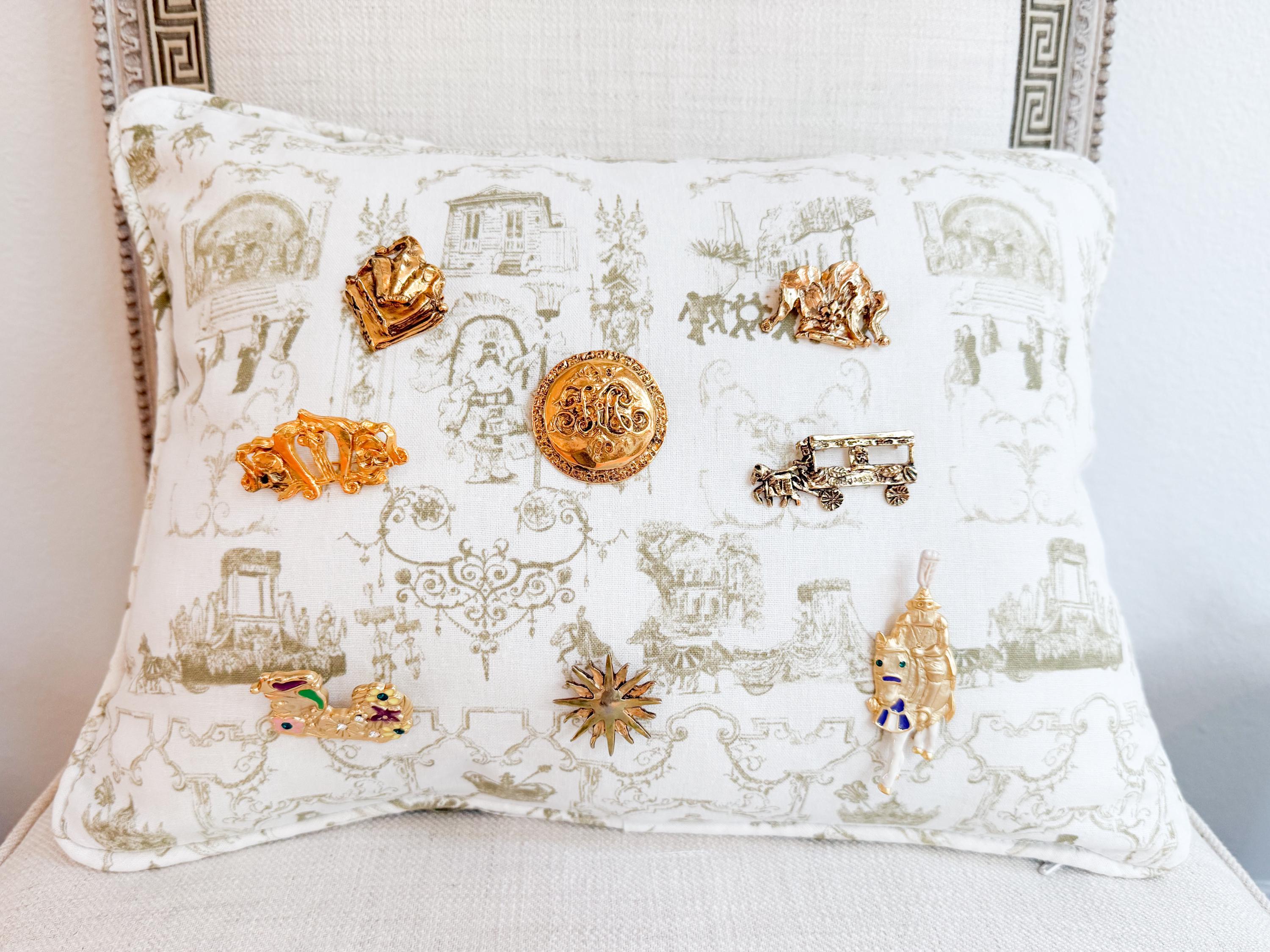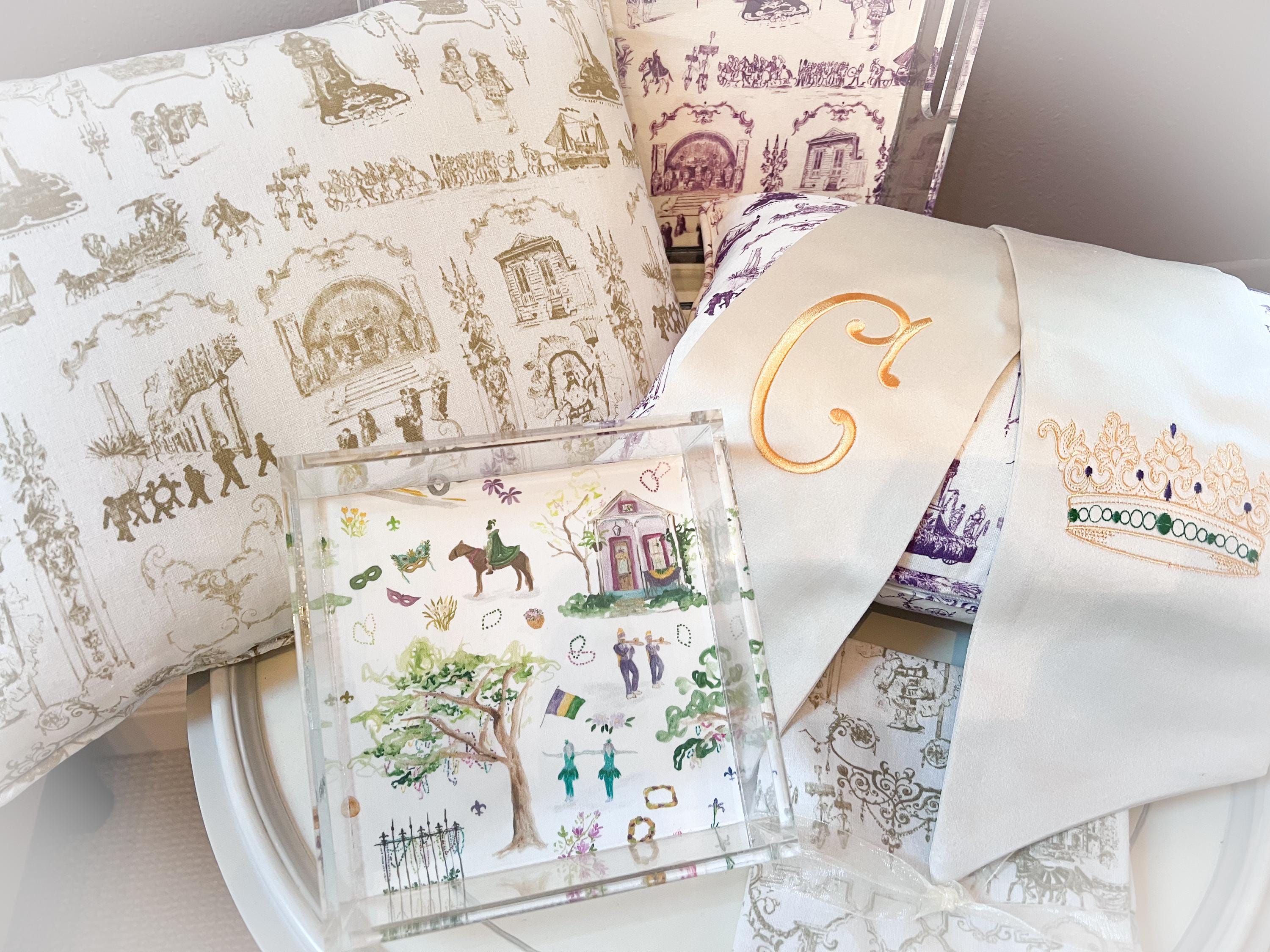 Celebrate New Orleans and its unique culture with our elegant toile pillow. The fabric features scenes of Mardi Gras and our architecture. Beautifully created with piping around the edge and zipper closure. It is machine washable on delicate. Measures 12" x 16"