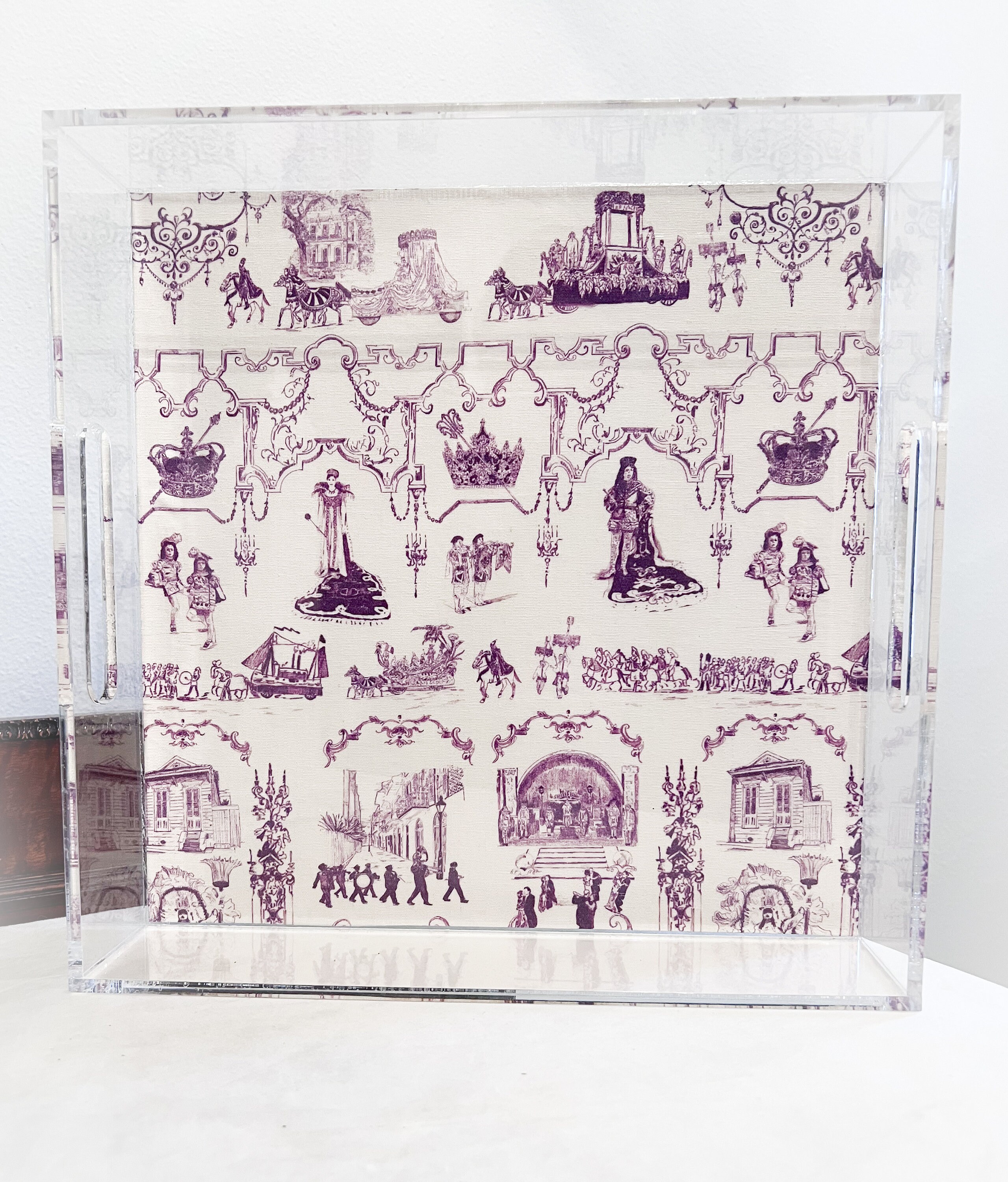 Celebrate New Orleans with this beautiful custom made Mardi Gras Acrylic Tray. Elegant insert with traditional remembrances of Carnival in New Orleans and charming landmarks. Beautifully decorate your home with this classic tray or give as a gift.