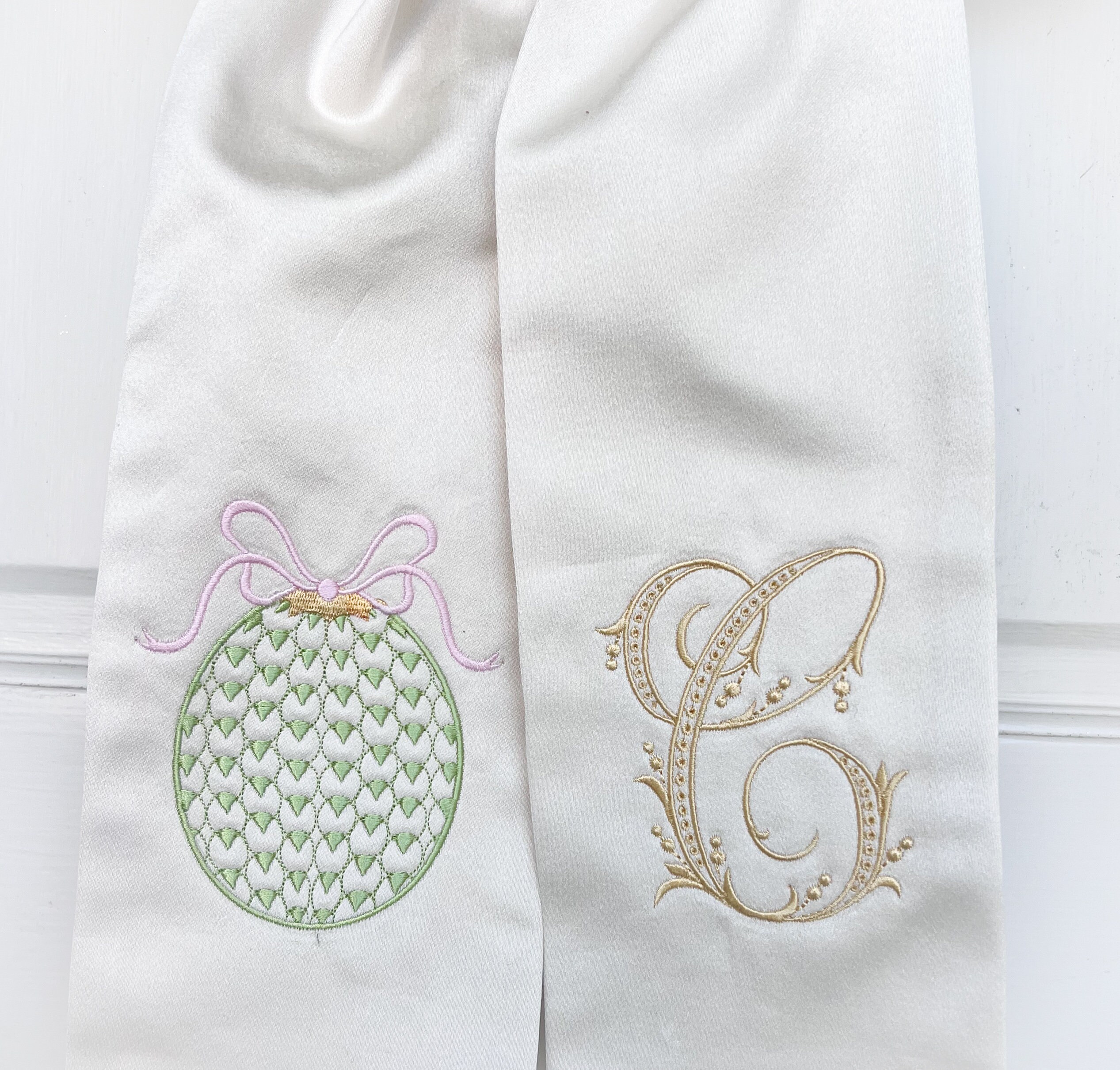 Celebrate Easter with this gorgeous sash adorned with chic egg and personalized with single initial. Both the egg and initial are monogrammed as shown in picture but the colors can be changed if you would like.