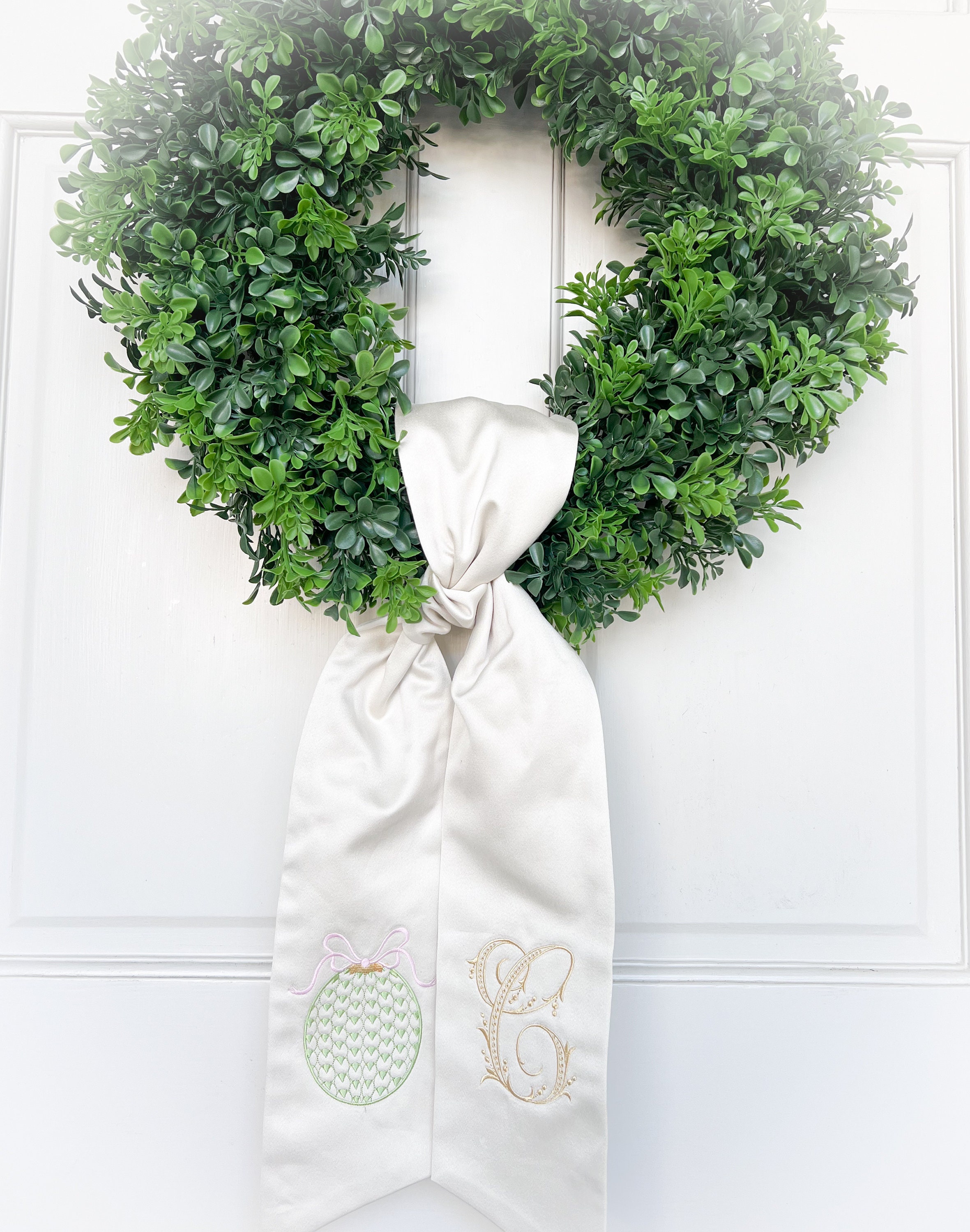To hang your wreath sash, tie the sash at the bottom of your wreath in a knot and adjust so the knot it is on the bottom of your wreath.
