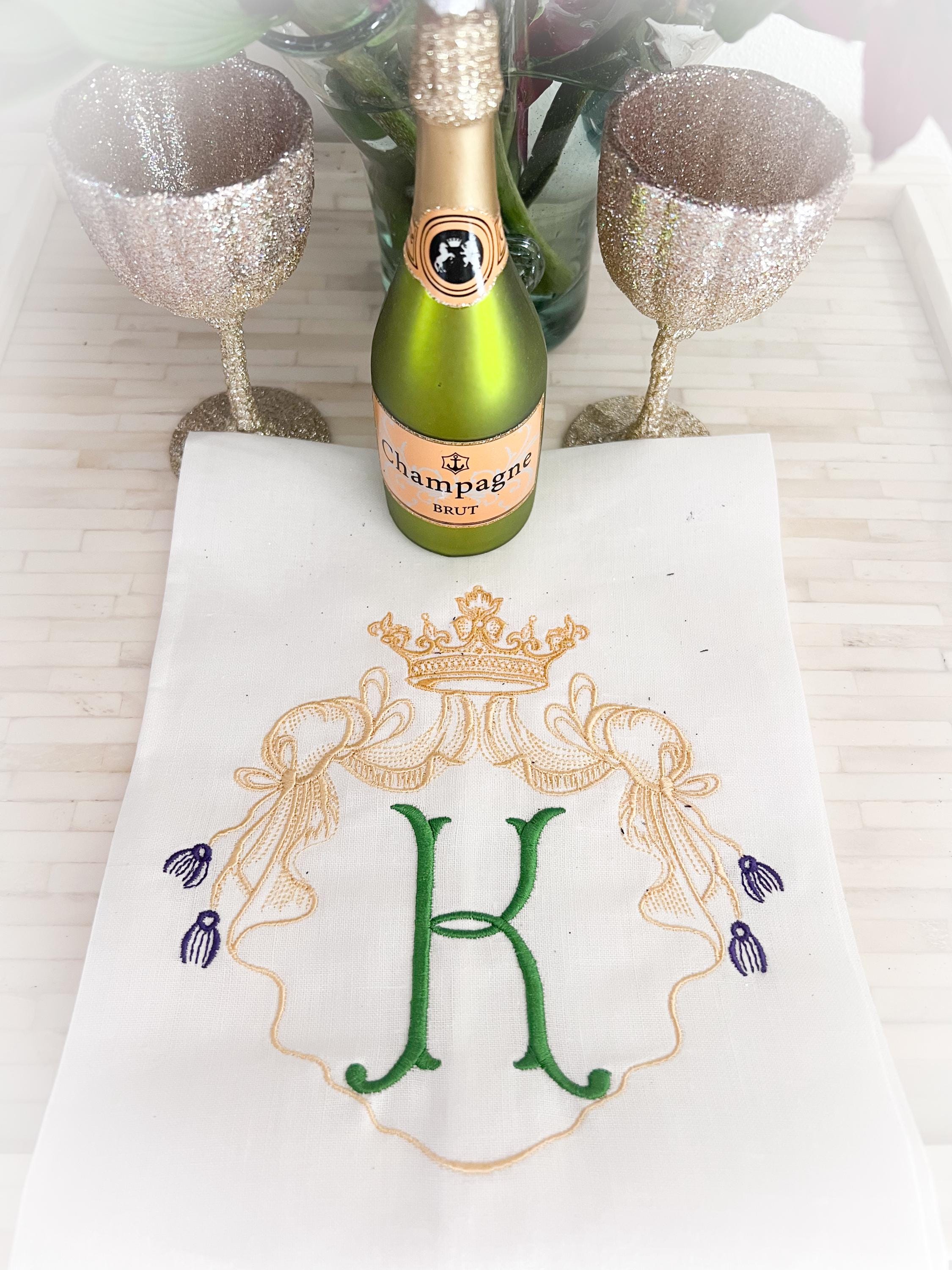 Add a touch of whimsy to your home with our royal crown hand towel. The towel is adorned with a crown crest and initial. It is perfect for yourself or a fabulous hostess gift! The monogramming is stitched in traditional Mardi Gras colors.